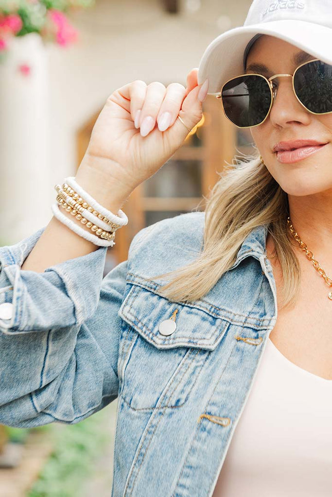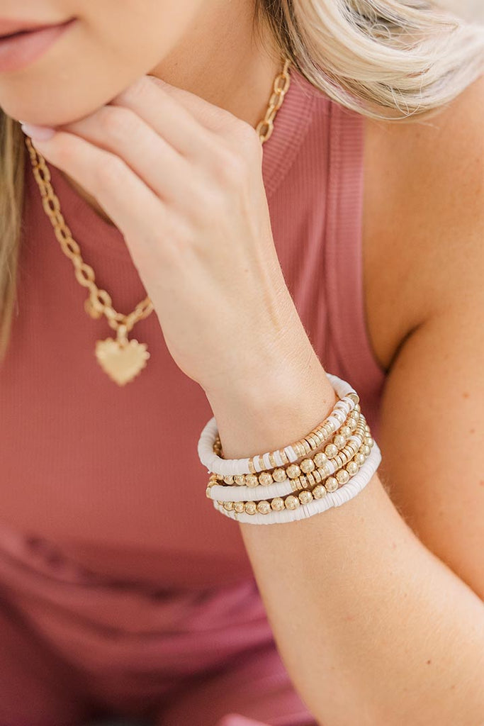 Elevate your everyday look with this elegant White Beaded Bracelet Set. Featuring a beautiful combination of polished gold beads and minimalist white discs, this set is perfect for stacking or wearing solo. The stretchy design ensures a comfortable fit while maintaining a refined, chic aesthetic. Whether you're heading to brunch or a night out, these bracelets add a subtle touch of sophistication to any outfit.
